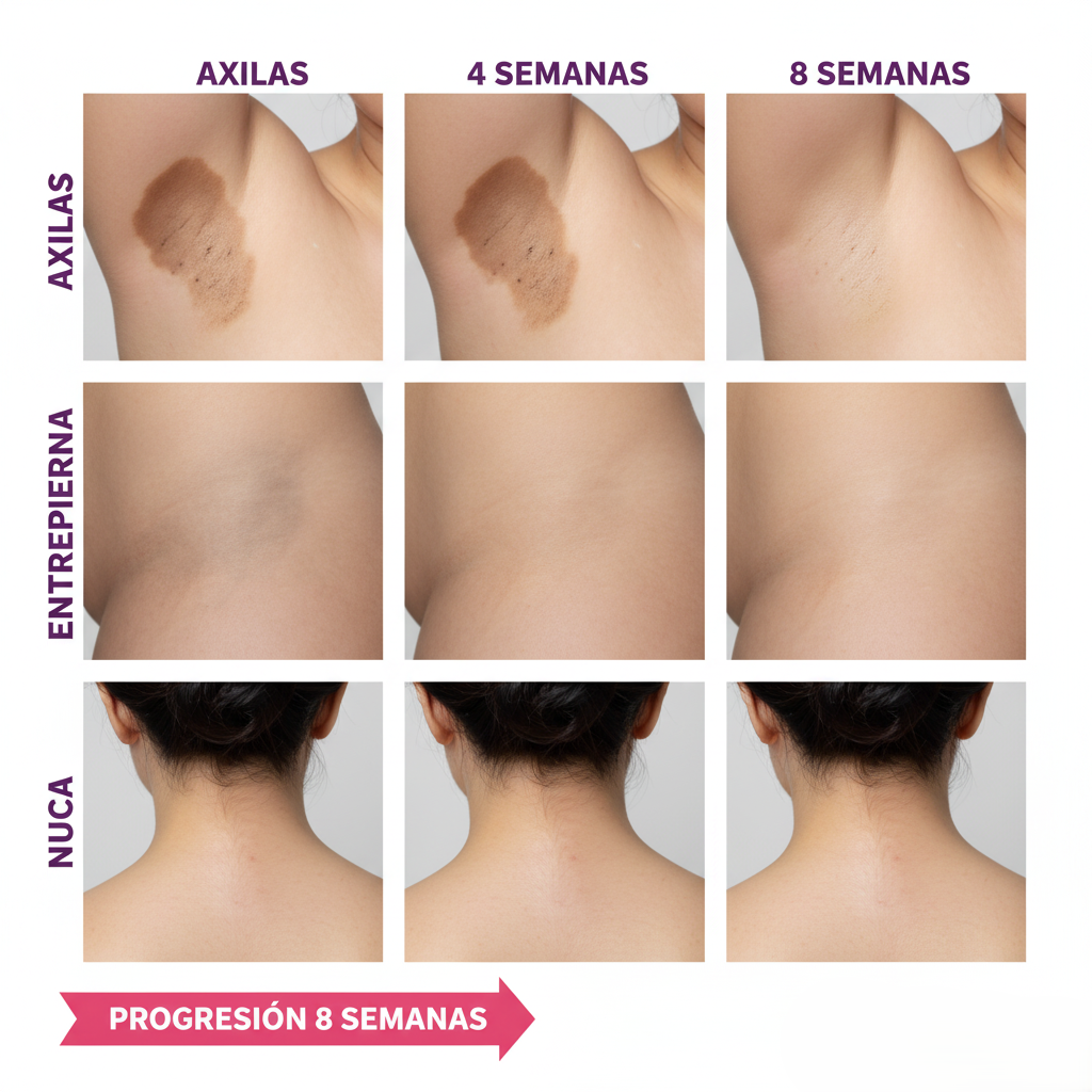 Reduce visiblemente la hiperpigmentación causada por depilación, roce, sudor o cambios hormonales. Tono uniforme y natural desde la primera semana.